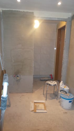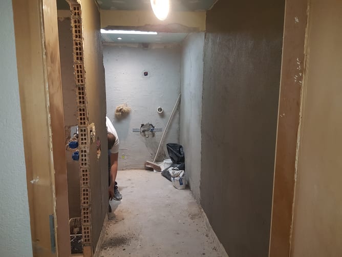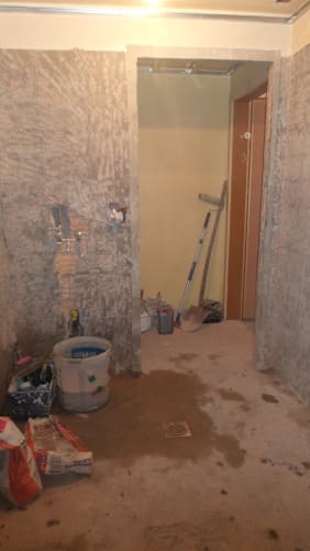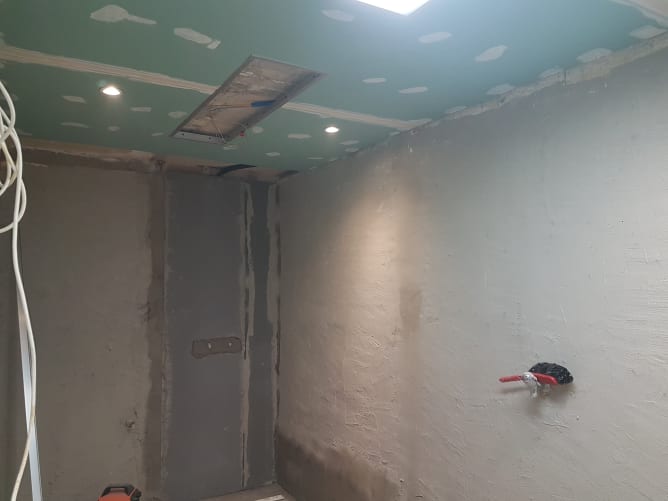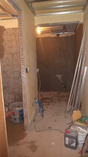 Deuxième couche de ciment versé sur le trou qu’il y avait au sol du futur vestiaire; plusieurs couches de lissage du plafond au futur vestiaire (tellement il était abimé); suite de la pose des placoplatres, grattouillage des reste de ciment collé aux 2 murs de la future cuisine, afin de pouvoir passer au lissage…