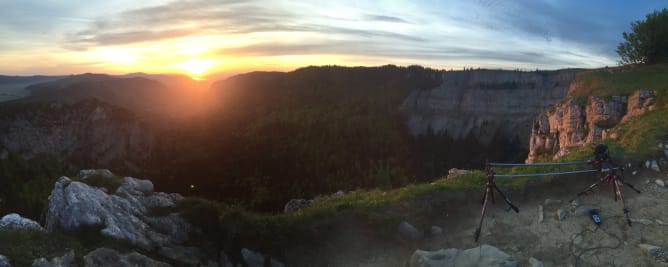 Nun ist es endlich so weit! Das Material ist gemietet, das Zelt ist gepackt und die Akkus sind geladen. Bei perfektem Wetter starten wir heute zu unseren Drehtagen auf dem Creux du Van.