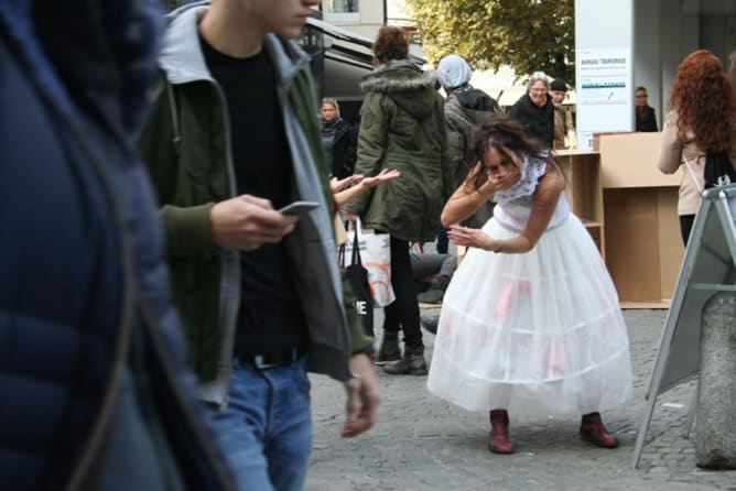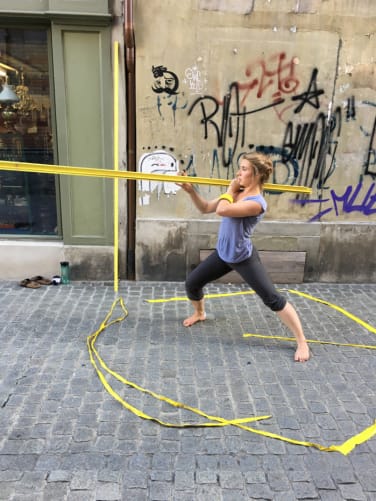 Ein interaktives Kunstprojekt an der Schnittstelle von Performance/Tanz und Bildender Kunst. Eine installative Performance im öffentlichen Raum, frei zugänglich für Passanten und im Rahmen von geführten Rundgängen erlebbar.