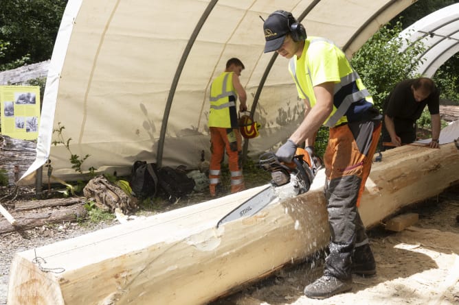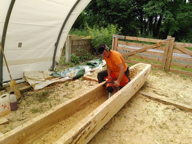 Ihr habt geliefert, nun geht’s für uns ans Werk. Fast direkt an den Gestaden des Greifensees wird ab sofort an den drei Einbäumen gearbeitet. Dabei fliegen reichlich Späne und im Unterschied zu den Pfahlbauer*innen damals, stehen uns Werkzeuge zur Verfügung, mit denen vieles einfacher geht. Trotzdem ist sachkundige und sorgfältiges Vorgehen natürlich Plicht! Gerne halten wir euch über die Fortschritte auf dem Laufenden. To be continued…
