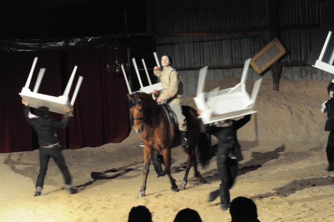 Des rêves qui nous collaient à toutes aux sabots depuis longtemps, puis des discussions autour d’un poêle à bois dans une roulotte du Centre des Arts Equestres du Cirque. Juin 2012: sortie de l’école de Cirque, La Panik en tête, et l’envie d’amener des chevaux là où on ne les attend pas. Une seule règle: «Dans le doute fonce!». Arrivées en Bretagne un peu par hasard et sans parachute, un seul plan établi: jouer jouer jouer! Les sorties de plages, les fins de marchés, les festivals de rues….Et à la fin de l’été, de nouvelles rencontres, le projet du «Hangar Saboté» (création d’un lieu de répétition, de spectacle et de vie pour la compagnie, qui depuis s’est agrandie).