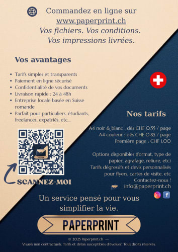 Paperprint is an agile micro-printing service born in French-speaking Switzerland, created to meet a simple but universal need: to print easily, without moving, and without compromising on quality.