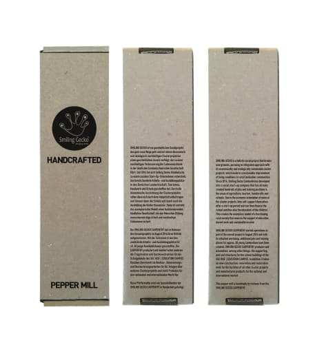 youths from the most unprivileged part of society in Cambodia by offering them vocational training in carpentry and allowing them to find purpose and in future, a job or run their own business in their community. Despite most of them being illiterate when they started their training, patience and hard work from both the teacher, the mentors and the apprentices themselves have made all of these trainings possible. This handmade PepperMill is proof of their hard work over the last 4 years of apprenticeship at the Carpentry, supported by Smiling Gecko, an NGO that direct aid in the form of finance and other support to people in need in Cambodia, sponsoring projects that are sustainable both from an ecological and economic standpoint.