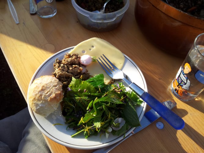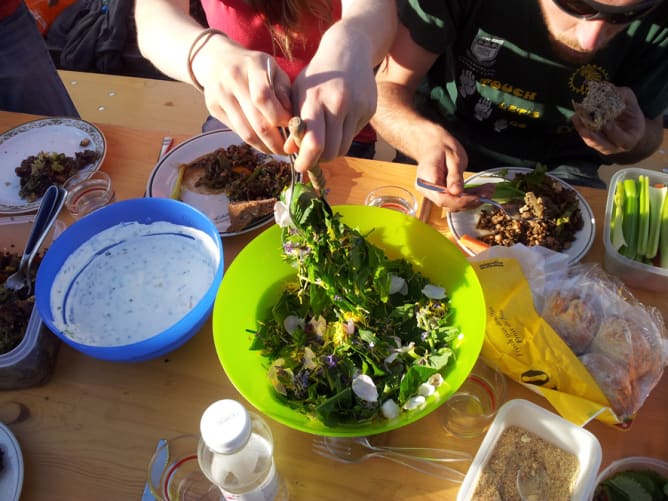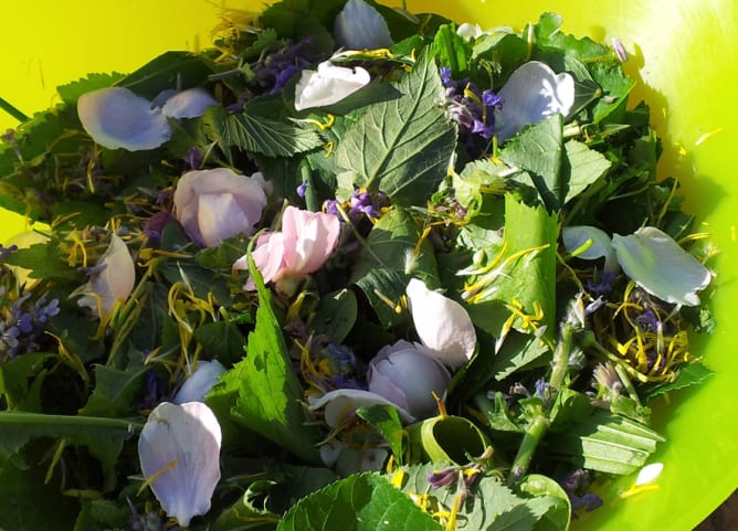 - Aus der Idee in unserem Gemeinschaftsgarten einen Wildsalat anzubieten, ist die Idee entstanden mit einem «Blumenstrauss» aus Wildsalat mit Wildkräutern in der Stadt Zürich an verschiedenen Locations (Bioläden und Vegi-Restaurants) zu gehen und die Pflanzen probieren zu lassen. Es gab sehr interessante und unterhaltsame Reaktionen in den Restaurant und auf der Strasse. Eine Passantin meinte zu mir ich solle doch dem Blumenstrauss mal wieder Wasser geben, bevor ich ihn meiner Liebsten gebe. Darauf antwortete ich, dass dieser «Blumenstrauss» eher noch in meinem Magen laden wird :-).