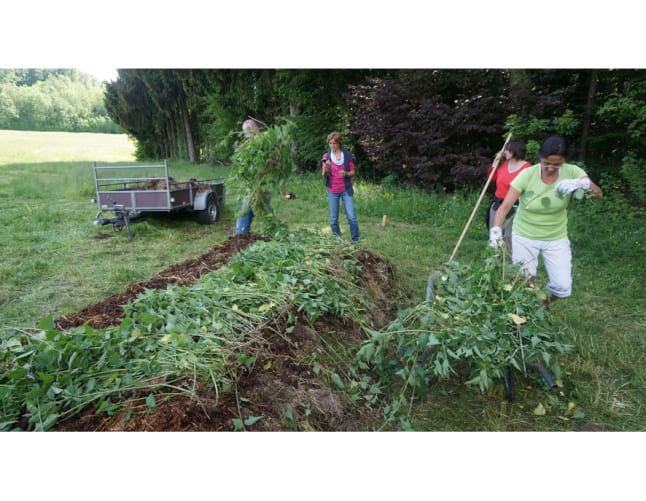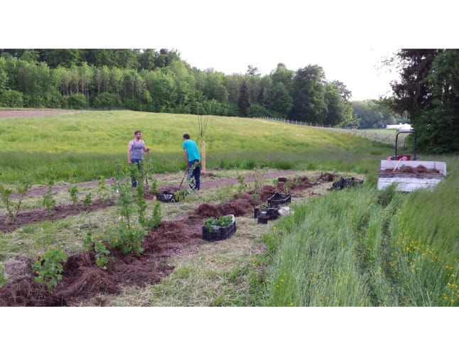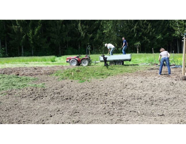 - Zwei Abschnitte der Baumgilden wurden mit Bodenbearbeitung, Mulchen und dem Bepflanzen dieser Flächen mit Kräutern, mehrjährigem Gemüse und Kleingehölzen erstellt.
