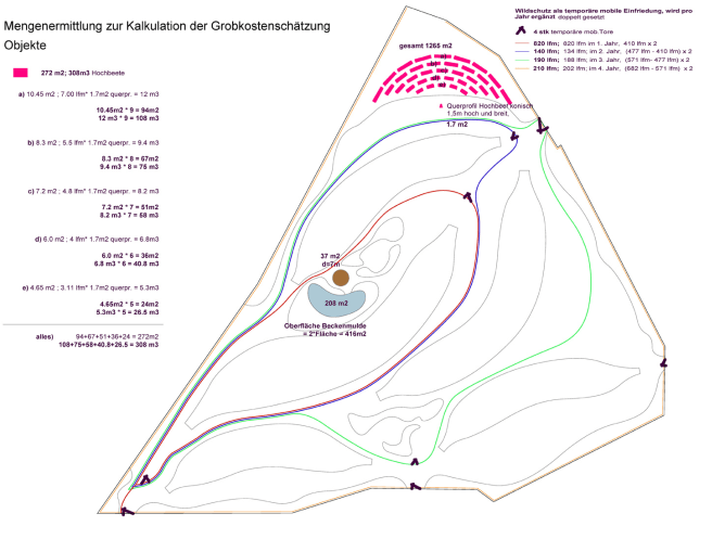 Z.B: was kostet eine Umstellung auf Permakultur, welche Kosten lassen sich durch Eigenangagement und Förderung (richtig eingesetzt) einsparen. Welche Investitionen machen kurz-, mittel- und langfristig Sinn? Dafür braucht es genauere Analysen, vergleichbar der Kostenermittung in der Landschaftsarchitektur, die sich z.B. an Mengenberechnungen (Download PDF) orientieren.