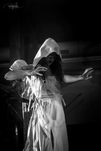 Nous voulons considérer la scène comme un sanctuaire, sur laquelle nous proposons une expérience rituelle. Nous aimons voir vos silhouettes figées, vos yeux se fermer et vous imaginer vivre un voyage bercé par les chants chamaniques, les bains de gong et l’odeur de l’encens.
