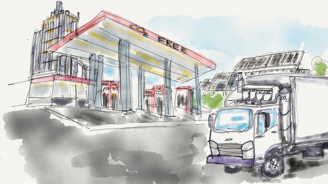 Nous avons développé un kit qui se fixe sur les poids lourds et capte le CO2 directement à la sortie des gaz d’échappement. Celui-ci est ensuite liquéfié et stocké à bord jusqu’à ce qu’il puisse être déchargé, puis recyclé.