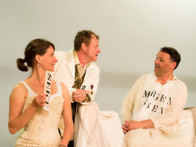 Wir lesen Dürrenmatts Text über den unaufhaltsamen Untergang des römischen Reiches (und seines letzten Kaisers) als ein plakatives Produkt. Wir haben uns das Plakative auf die Fahnen geschrieben. Einerseits versuchen wir widrige Figuren übertrieben zu zeichnen, andererseits haben wir das Plakative aber auch auf bildlicher Ebene umzusetzen versucht, indem gewisse gesprochene Repliken durch geschriebene Plakate verdoppelt werden. Dies führt zu einem sehr spielerischen und – so hoffen wir – witzigen Umgang mit Dürrenmatts Stück; ganz nach der Devise Romulus’: «Wer so aus dem letzten Loch pfeift wie wir alle, kann nur noch Komödien spielen.»