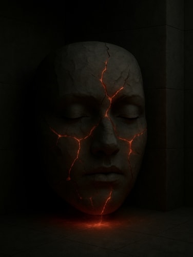 Im Zentrum steht ein Gesicht – ruhig, fast still. Doch Risse durchziehen die Oberfläche wie glühende Bruchlinien.