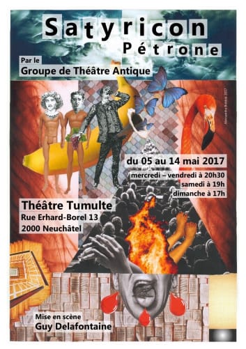 Chaque création du GTA a pour point de départ un travail de traduction réalisé par des assistant-e-s et des étudiant-e-s passionné-e-s de l’Université de Neuchâtel. Depuis 1989, le GTA applique sa formule unique et éprouvée de traduction nouvelle et d’adaptation à la scène. Les aléas du temps ne nous ont laissé que des fragments du Satyricon: l’équipe de traduction et de dramaturgie a pris le parti de jouer avec les trous, les sauts et les ruptures.