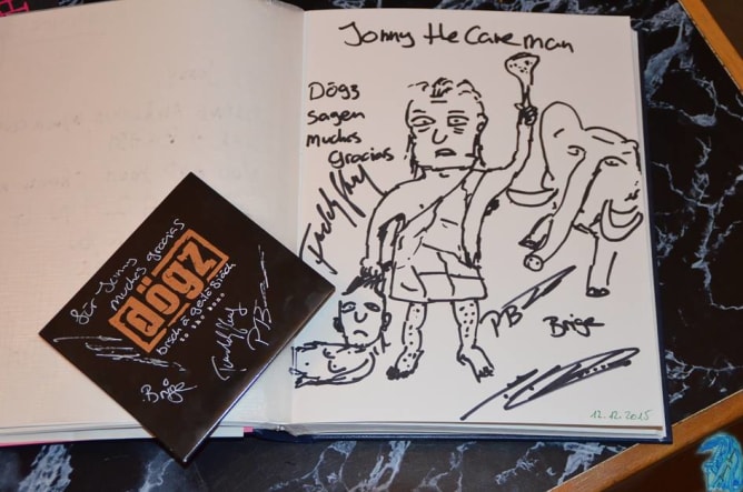 «als musiker ist man nicht immer willkommen. manche behandeln einem wie angestellte, bedienstete oder ihr temporäres eigentum. die besten konzerte gelingen nur dort wo wir als gäste empfangen werden. wir kommen als fremde und gehen als freunde. so entstehen bindungen welche ein leben lang halten können. veranstalter und lokale welche mit der gleichen hingabe wie wir im rock n roll verwurzelt sind, sind die kronjuwelen unserer szene. deshalb ist jonnys lion cave mein zuhause. muchas gracias jonny» -PG-