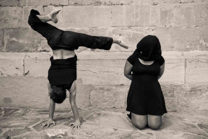 Gnoko Bok, en wolof « plaisir partagé, on est ensemble » est un projet de cirque contemporain in situ. Au travers de l’esthétique d’un conte écrit après une tournée au Sénégal, les artistes Tania Simili et Estelle Borel, invitent le public à s’immerger dans un chantier dont la recherche s’inspire d’une citation de Carolin Emcke : « je cherche quelle force poétique, quel biais littéraire permet de résister efficacement à la violence ». C’est entre deux mondes que les artistes évoluent, sur un fil, un mât chinois, la terre et les cieux :