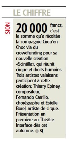 A présent, il va falloir le faire vivre et tourner ! C’est du coup de bonne augure que scintilla ait été sélectionné pour la bourse suisse aux spectacles 2017 à Thoune. Nous pourrons rencontrer des programmateurs et un large public national.