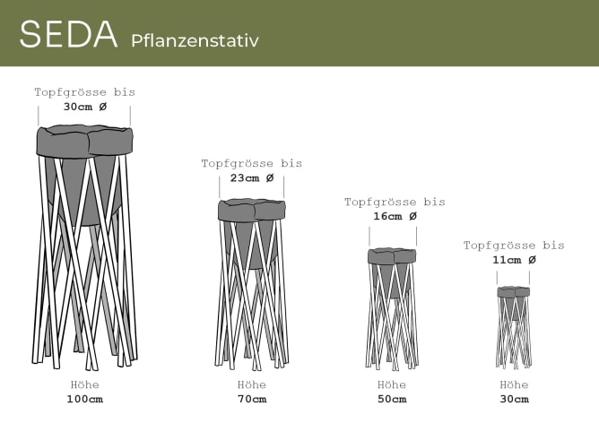Das Pflanzenstativ ist in den Grössen 30cm, 50cm, 70cm und 100cm erhältlich. Alle Grössen gibt’s in den Farben «Buche Natur» und «Schwarz geölt». Für die Farbwahl werden wir Dich nach Abschluss der Kampagne in Form einer Umfrage kontaktieren.