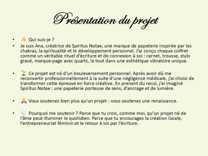 Je suis Ana, créatrice de Spiritus Notae, une marque de papeterie inspirée par les chakras, la spiritualité et le développement personnel. J’ai conçu chaque coffret comme un véritable rituel d’écriture et de connexion à soi : carnet, trousse, stylo gravé, marque-page avec quartz, le tout dans une esthétique vibratoire unique.