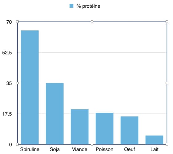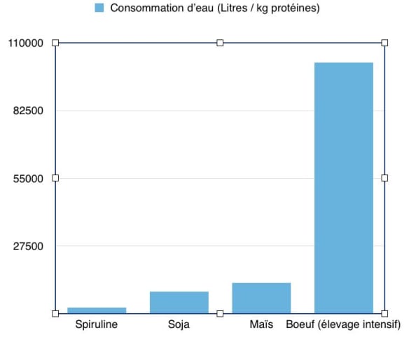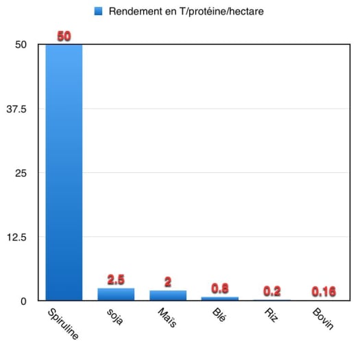 La spiruline est l’aliment le plus riche actuellement connu sur la planète. Cette micro-algue est vieille de plus de trois milliards d’année. Elle se reproduit dans des lacs légèrement salés et très alcalins, aujourd’hui essentiellement au Tchad, en Birmanie, en Inde. Très riche en protéines, vitamines et sels minéraux, elle nécessite 30 fois moins de surface cultivable que pour le soja, 40 fois moins que pour le maïs et… 300 fois moins que pour la viande de bœuf !