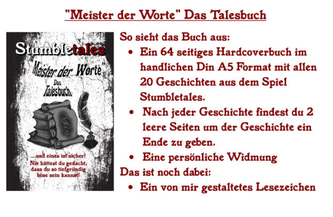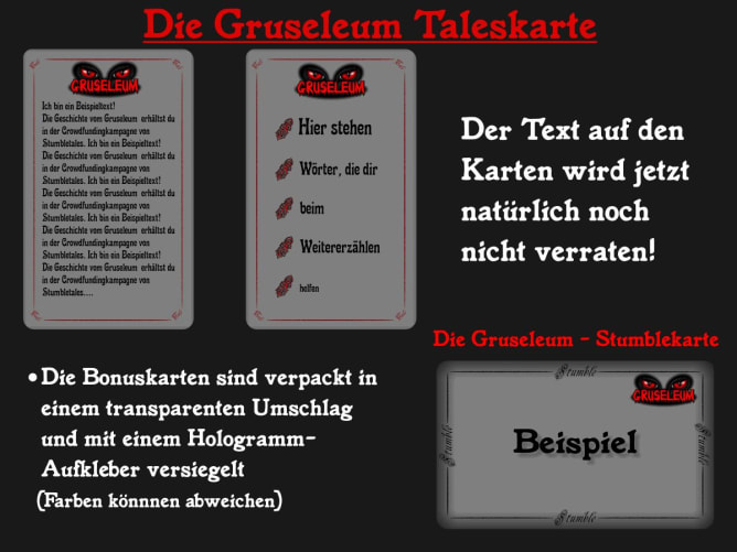 Und damit bin ich nun hier. Mit dem Ziel dir Stumbletales zu präsentieren, dich als Unterstützer zu gewinnen, die 500 Spiele in den Druck zu geben und dich in die Welt des Gruselns zu entführen.