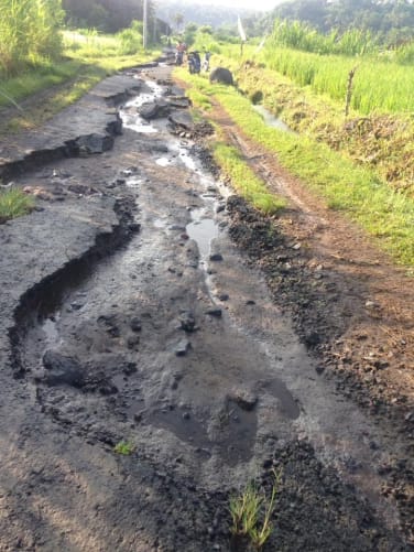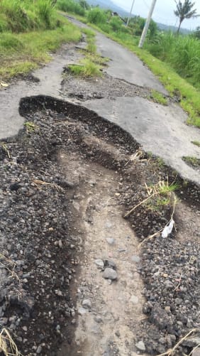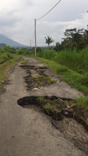 Village villagers in Peladung use this road daily. There was an accident two days ago, because the road became impassable. A girl and her dad were wounded, one on the arm, the other had her leg crushed during the fall of the two wheels they use to go to plant and harvest the rice that allows them to survive. Today, the government is engaged in the precious assistance of the volcano’s refugees, Mount Agung, which has been in operation since 22 September 2017. Nearly 150,000 refugees have benefited from Indonesian state aid since long weeks. But the villagers, to go work in their rice fields, to go home, to go to town … have no choice but to take this road become very dangerous. While waiting for the government to proceed to the complete reconstruction of this road, from the return to the peaceful life before the volcano came into operation, a restoration to make it practicable without putting myself in danger seems to me to be an interesting compromise . For these villagers, in their names, I thank you for the gesture of support that you will bring them.