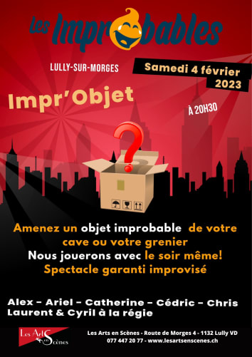 Et, ce samedi 4 février, nous retrouverons la Cie «Les improbables» qui nous émerveillera et chatouillera nos zigomatiques avec ses impros improbables à partir d’objets sortis tout droit de notre cave, de notre grenier ou de notre salon !