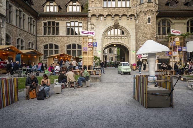 Our gastronomy is rooted in sustainable principles: the fully plant-based menu is crafted by renowned Zurich-based establishments, showcasing our commitment to eco-friendly cuisine. Hofkino operates on renewable energy, minimizes food waste whenever possible, has exclusively used glass packaging since last year, and prioritizes sustainable construction. Our goal is to make this large-scale event as environmentally friendly as possible.