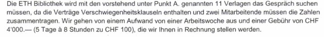 Die ETH-Bibliothek - immer noch aufgebracht das ich mich an einer anderen Stelle öffentlich dazu bekannt habe, den «Vordenker» nicht im Direktor Rafael Ball gefunden zu haben - hielt bei der Schlichtungsverhandlung beim EDÖB an hohen Gebühren für weitere Daten fest. Letztlich stand am Ende der Schlichtung das Angebot, dass ich für eine inhaltlich reduzierte Anfrage ’nur’ noch 600 Franken zu bezahlen hätte (https://goo.gl/4B5UT4) , anstatt wie zuerst verlangt 4000 Fr. (https://www.oeffentlichkeitsgesetz.ch/deutsch/2016/07/jetzt-versucht-es-die-eth-mit-uberrissenen-gebuhren/).