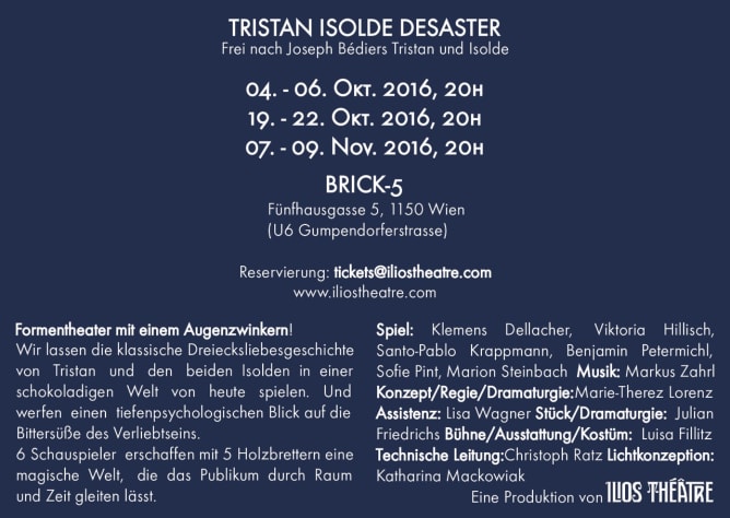 Wir kommen in den Proben gut voran – das ist gut so, denn die Premiere naht mit Riesenschritten: heute in 3 Wochen ist es soweit, am 4.10. im Brick-5 um 20h findet die Uraufführung von TRISTAN ISOLDE DESASTER statt!