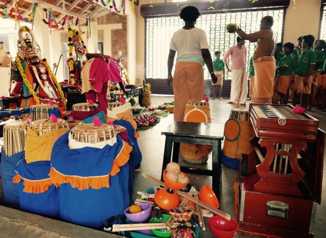 Today at the Kattaikkuttu Sangam school we celebrated the birthday of Saraswati, goddess of knowledge, wisdom and arts. Tradition in India says that today is a good opportunity to learn something new and bless your most precious belongings. The altar was full of Kuttu costumes, music instruments, notebooks and for the first time…diabolos!!