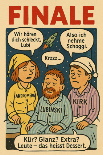 Deckmann Lubinski (knisternd aus dem Maschinenraum): «…Krzzz….Hallo, hallo…. Captains, hallo Crew, hallo Houston – wir sind bei 104 % … krzzzz …» Captain Andromeda: «Wir hören dich schlecht, Lubi. Aber ja, das ist wie Schoggi nach Mitternacht: keiner braucht sie, aber alle lieben sie.» 🍫✨ Captain Kirk: «Leute, hört auf zu blödeln, wir hängen leicht schief im All. Kann es sein, dass das wegen Übermüdung ist? Kennt sich da jemand aus?» Captain Andromeda: «Sehr gut möglich, Kirk. Wir sind auch ultrasonic geflogen. Aber hey – so geleuchtet hat vor uns noch keiner.» Deckmann Lubinski (krzzzz): «Klemmt euch den Arsch … krzz … Sie haben uns schon gerettet. Alles, was jetzt noch kommt, ist Kür, Glanz, krzzzz, Extra.» 🎉 Captain Kirk (grinst): «Kür? Glanz? Extra? Leute – das heisst Dessert. Und ich nehme Schoggi.» 🍫