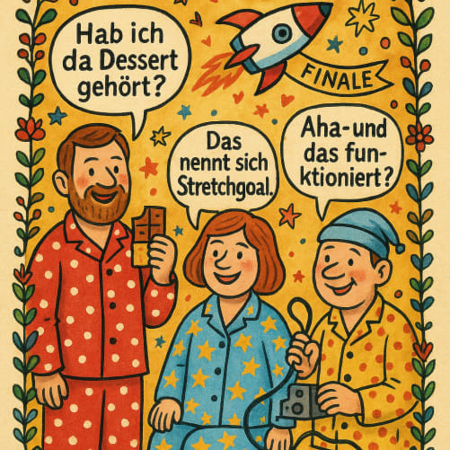 Captain Andromeda: «Wer hat das mal gesagt? Das ist wie eine Waschmaschine, die längst fertig ist – und trotzdem noch fröhlich schleudert.» Captain Kirk: «Also ich war’s nicht, Andromeda. Wir leuchten nur. Vorausgesetzt, Lubi hat die Sicherung endlich gefunden.» Lubinski (krzzzz aus dem Maschinenraum): «Sicherung? Die Sicherung und ich haben seit 1987 ein sehr kompliziertes Verhältnis…» Captain Andromeda: «Lubi, konzentrier dich. Wir sind im Stretchgoal. Das ist, wenn man bei wemakeit übers Ziel hinaus noch weiter spendet.» Lubinski: «Aha. Und das funktioniert?» Captain Andromeda: «Natürlich. Jedes Dessert nach dem Hauptgang funktioniert – man nennt es Stretchgoal.» Captain Kirk: «Hab ich da Dessert gehört? Das ist mein Zielgebiet. Schoggi ist Navigation! Mit Dessert findet man immer den richtigen Kurs.» 🍫 Captain Andromeda: «Und der Kurs lautet?» Captain Kirk: «Na wohin schon – ins Finale. Also streckt euch! Äh… stretcht euch! Ich meine: haut einfach rein! Wir nehmen alles!»