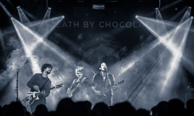 Lange Jahre auf Namenssuche, wurde das Schweizer Rock-Quintett in London fündig, auf einer Speisekarte. «Wir waren auf einem Ausflug nach England», berichtet Mathias Schenk, Sänger und Gitarrist der Kapelle. «Irgendwann sassen wir in einem Restaurant, das als Dessert «Death By Chocolate» anbot. Ich hab’s probiert, es ist ein Mörder-Schokoladenkuchen, der sich wie ein Faustschlag in den Magen anfühlt.» Eine süsse Versuchung, nicht frei von Gefahr, diese Idee gefiel den Mannen aus Biel und so wählten sie Death By Chocolate zu ihrem Namen.