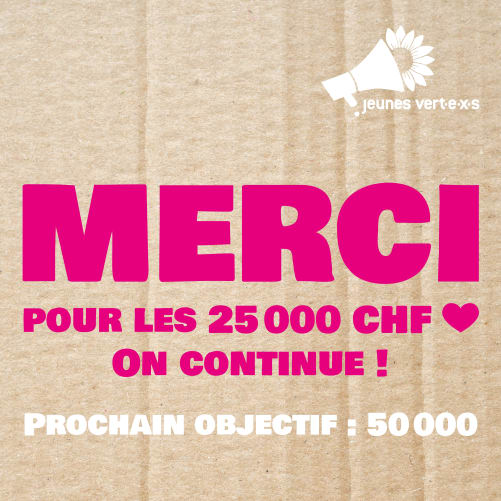 WOW ! On est dépassés. On a atteint notre premier objectif de crowdfunding de 25’000 CHF en moins d’une semaine. On vous remercie de tout cœur pour votre aide! On est sur la bonne voie, car beaucoup de gens aimeraient une politique plus jeune et plus verte au Conseil national. L’engagement pour notre campagne nous montre qu’il est possible de faire encore mieux. Pour couvrir une part encore plus importante de nos dépenses et mener une campagne encore plus visible, on se fixe comme objectif supplémentaire 50’000 CHF pour les 23 jours restants du crowdfunding. Merci de continuer à nous soutenir et de partager notre projet autour de vous. 🔥