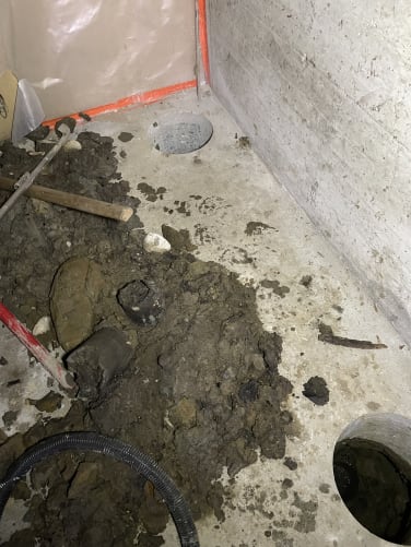 In der angrenzenden Garage haben wir nun den Boden aufgebrochen und einen Graben ausgehoben. Seither haben wir in den Kernbohrungen trocken. Wir sind zuversichtlich, nun endlich die Ursache von unserem Wasserschaden gefunden zu haben.