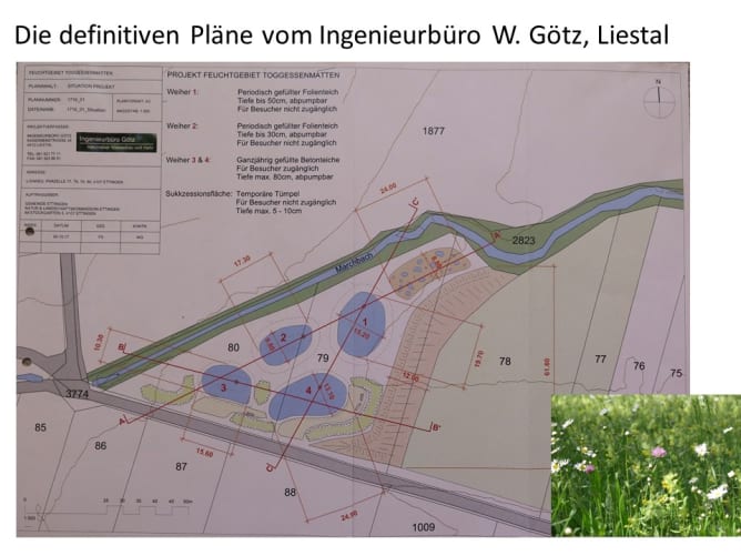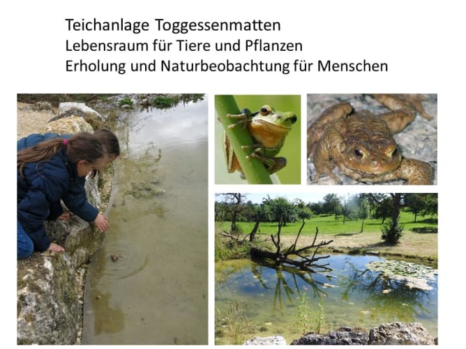 Im Naturschutzgebiet Toggessenmatten soll durch den Bau verschiedener Weiher ein Lebensraum für mehrere Amphibien-, Reptilien- und Vogelarten realisiert werden. Es soll gleichzeitig ein attraktiver Ort für Naherholung und Naturbeobachtung der Bevölkerung werden. Das Projekt des Naturschutzvereins (NSVE) sieht vier Teiche unterschiedlicher Wassertiefe, ein Feuchtgebiet, eine Blumenwiese, Hecken und gegen die Siedlung einen Lärmschutzwall vor. Von den für den Bau benötigten CHF 235’000.- fehlen uns nur noch CHF 25’000.-(Genaueres unten). Deine Spende kann von den Steuern abgezogen werden.