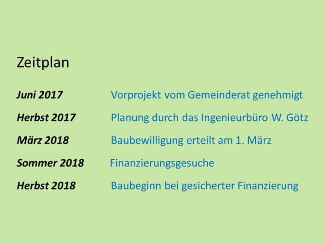 - Besitzverhältnisse: Die zur Realisierung des Projekts nötigen Parzellen wurden im Januar 2017 durch die Einwohnergemeinde erworben.