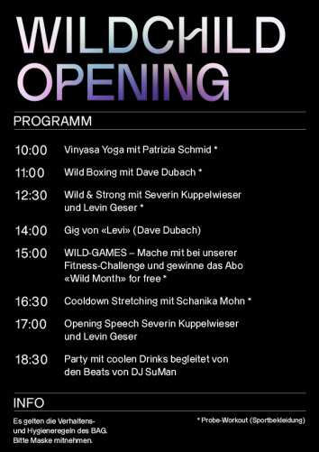 Am Samstag 11. September ist es soweit! Wir freuen uns riesig, dich zur Eröffnung unseres Training Studios WILDCHILD einzuladen. Alle Infos zum Programm findest du im angehängten Flyer.