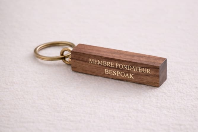 den BESPOAK Founding Supporter Schlüsselanhänger aus Holz, gefertigt aus Holzresten der Werkstatt.