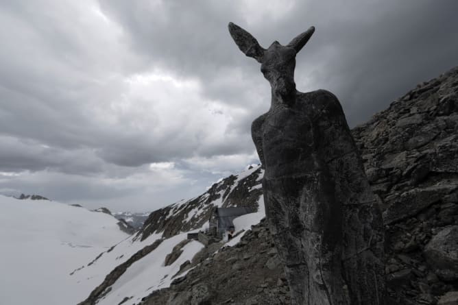 In 2014, the artist and mountaineer, Nikola Zaric (1961-2017) installed, with the authorization of the « Swiss Alpine Club»(CAS) , 2 sculptures at the «Trient» Mountain hut in Valais, Switzerland ;A Woman-hare and a wing-armed donkey-man. (casted in concrete). Since then they welcome hikers, tour skiers and climbers. They have become a part of the landscape and emblems of the mountain hut. Originally temporary, these sculptures were destined to be taken down.